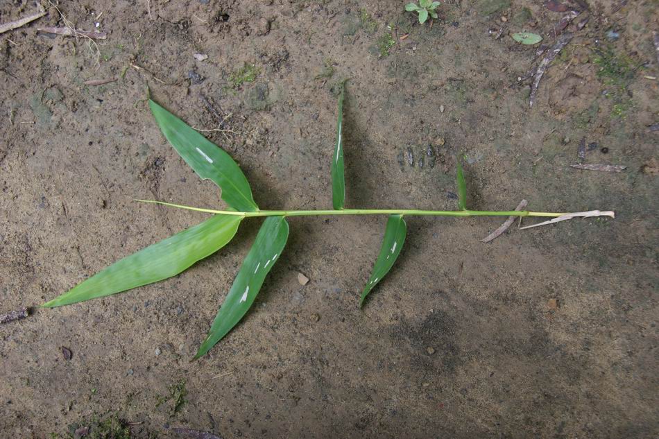 常綠高竹,株高5-15公尺,叢生型。桿枝節間呈黃色,籜耳突出,籜片表面淺綠具黃條紋,籜葉基部密佈細毛。