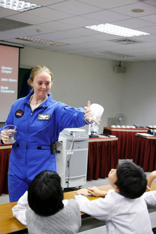 此次活動特別聘請美國NASA甘迺迪太空中心太空營( Camp KSC)的專任教師Ms. Jessica Sheffield擔任講師,希望藉由活潑生動的課程,引起學生對NASA及天文科學的興趣。由於課程幾乎以全英語進行,過程中搭配了專業術語的中文翻譯,讓學生更快地進入學習的領域,同時也上了一堂實用的生活美語課程。在當天的活動中,學生不但學到有關太空及NASA的相關知識,講師Ms. Sheffield更直接以簡單易懂的實驗說明太空梭防熱以及火箭發射的原理,引起學生熱烈回應。雖然Ms. Sheffield來自美國,但是她親切的解說態度和有趣的實驗卻拉近了與學生的距離,整個活動現場學生們不但專注聆聽,而且還熱烈地參與討論和發問,並且興致勃勃地動手製作太空梭模型,全體參與師生在多采多姿的活動中譜下了美麗的回憶。